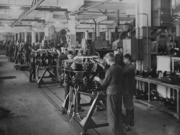 Рабочие завода им. П.И. Баранова за сборкой звездообразных авиадвигателей для фронтовой авиации. Омск, 1940-е годы © ОДК