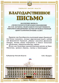 августе 2012 года коллектив филиала получил благодарственное письмо губернатора